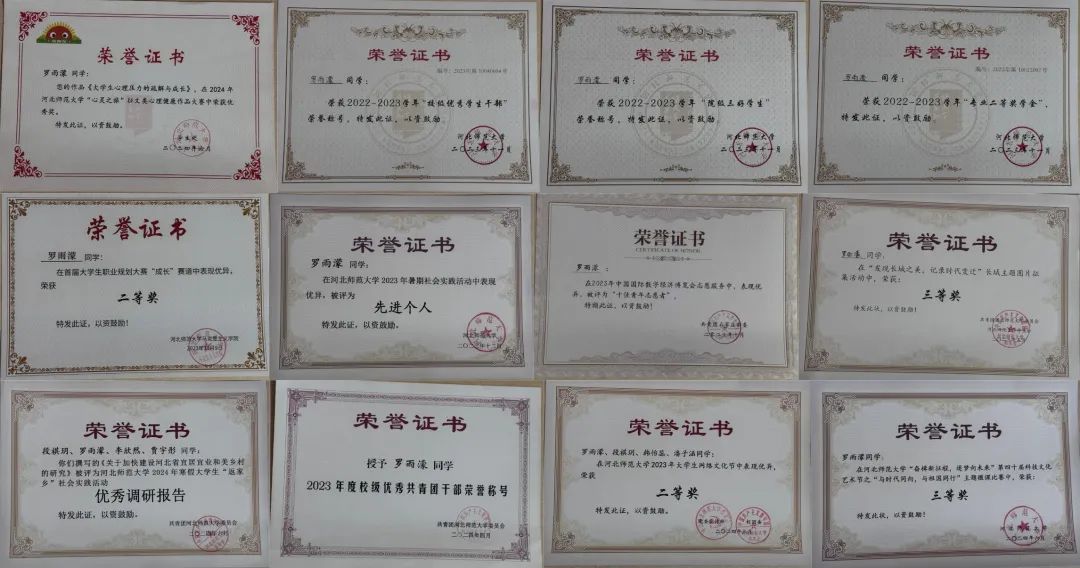 投身志愿服务,解锁成长密码。罗雨濛积极参与校内外各类志愿服务,用实际行动传递爱心,践行奉献精神。志愿时长累计296小时,曾在2023年中国国际数字经济博览会担任志愿者,对接世界500强企业京东方党委书记冯强先生,圆满完成一对一接待嘉宾组任务,获2023年石家庄市十佳青年志愿者称号。深入基层调研,助力乡村发展。她积极参与社会实践,2023年12月至2024年7月,她所在的琢玉队前往河北省5个典型和美乡村,围绕如何建设宜居宜业和美乡村展开实地调研,撰写出一篇5万余字的调研报告。2024年,琢玉实践队入选全国大学生“乡村振兴・青春笃行”计划实践队,且获永利 暑期社会实践优秀团队称号。她连续两年被评为永利 暑期社会实践先进个人,参与撰写的调研报告获2024年永利 寒假大学生“返家乡”社会实践活动优秀调研报告、2024年永利 暑期社会实践优秀调研报告。