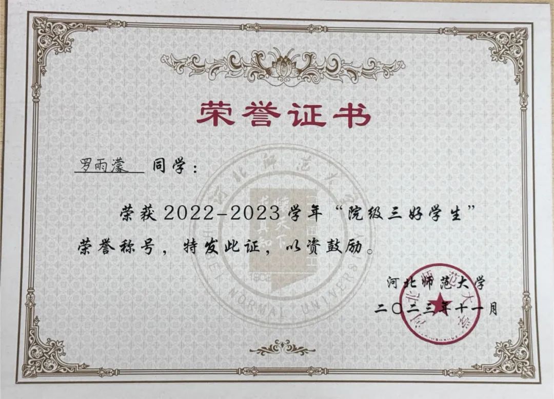 立身以立学为先,立学以读书为本。罗雨濛始终坚持践行青年马克思主义者的使命担当,在理论学习与实践探索中砥砺奋进。连续两年获永利 专业二等奖学金、院级三好学生,参加永利 第29期青年马克思主义者培养工程,并顺利结业。参与的科创项目获2023-2024年度河北省大学生“调研河北”社会调查活动立项1项,永利 大学生课外学术科技创新创业竞赛立项2项,永利 “挑战杯”竞赛红色专项活动立项2项。