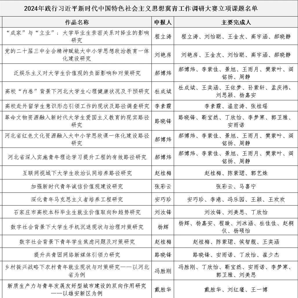近日,2024年践行习近平新时代中国特色社会主义思想冀青工作调研大赛立项结果公示,永利