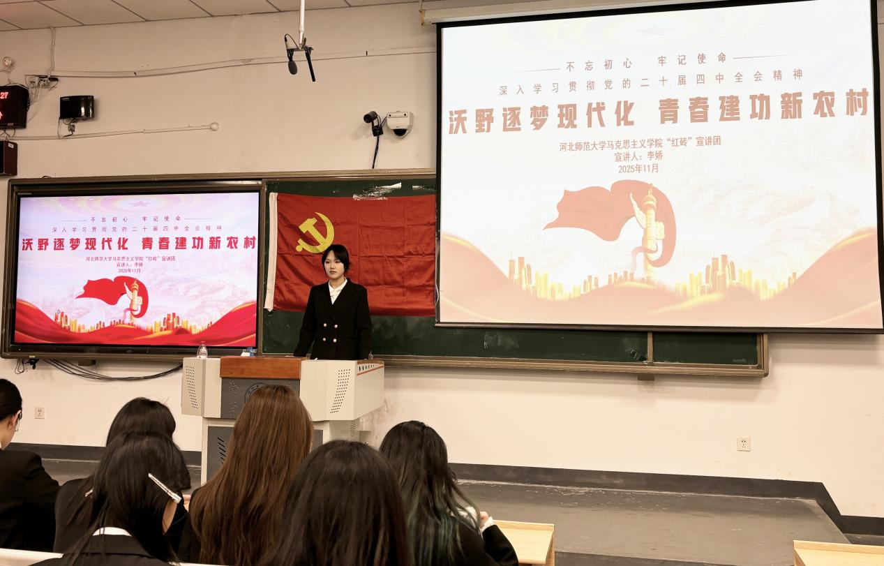 “红砖”宣讲团成员李娇围绕“读懂农业农村现代化”“谱写未来蓝图”“青年担当大任”三个方面,系统解读了党的二十届四中全会关于加快农业农村现代化的战略部署。结合江西“云上赣农”数字平台、赞皇酸枣产业发展等典型案例,生动阐释了科技赋能农业、产业振兴农村的实践路径,鼓励青年学子积极投身乡村振兴,以专业才干为农业农村现代化贡献力量。